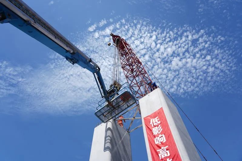 为了早日实现中环与外环的“握手”,项目部除了加强智慧工地建设,还引入了 “绿色、无污染、低影响”的免共振液压沉入钢管桩工艺、全预制拼装工艺以及新、老桥梁使用UHPC高强度混凝土快速拼接,加快了工程建设。