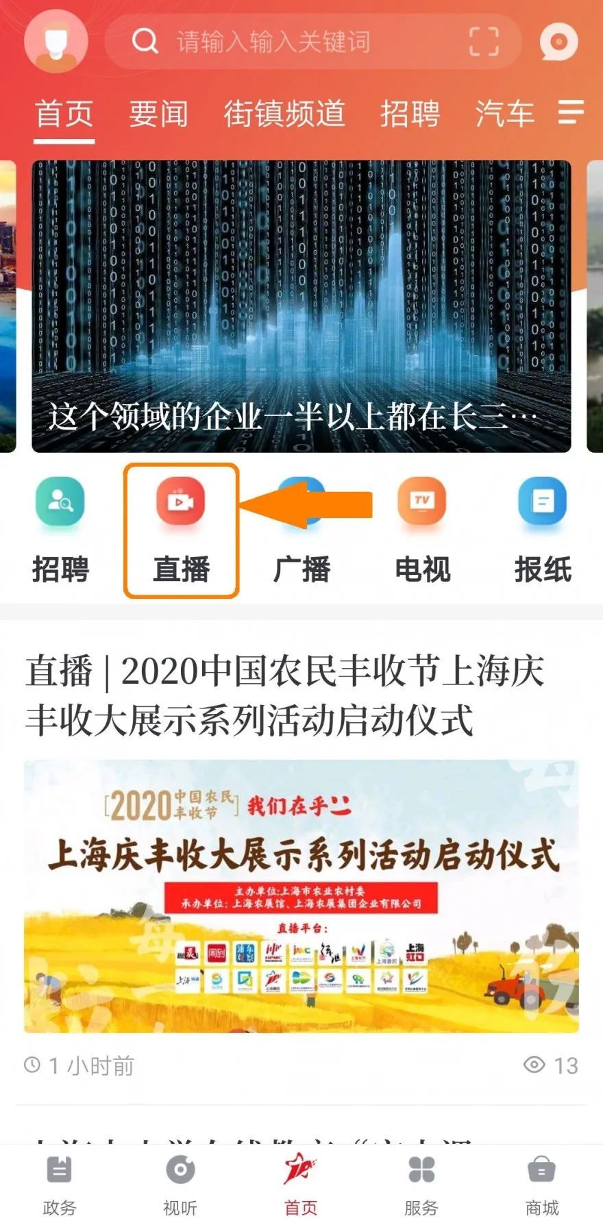点击首页中间“直播”栏目即可观看↓