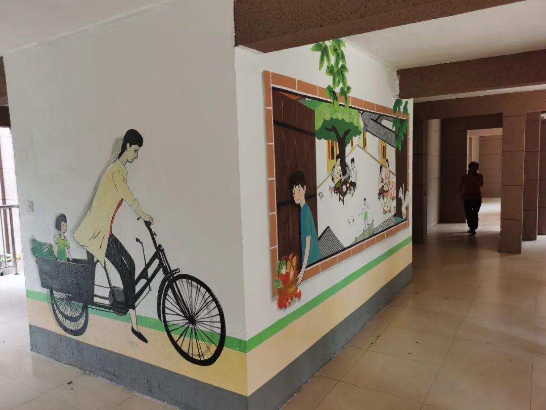 双桥社区是一个动迁小区,考虑到这里的居民大多来自农村,社区在架空层周边绿化带,用稻草垛、篱笆、具有农家特色的小动物雕塑进行装饰,展现旧时农村悠闲自得的生活场景。同时,社区还利用架空层的大幅墙面,采用3D墙画来展现旧时农村农耕及丰收的场景。在这幅画上,稻草垛为真实稻草装饰,画框也是真实竹框装饰,南瓜为板材立体突出装饰贴,再结合仿裂纹效果,营造出裸眼3D神奇视觉效果。而在另一面墙画上,则采取画中画的方式,利用门洞和窗户构建多层次空间,墙上挂着具有农家特点的老物件,展现旧时农村悠闲自得的生活场景,营造出其乐融融、具有风味和回忆感的画面。