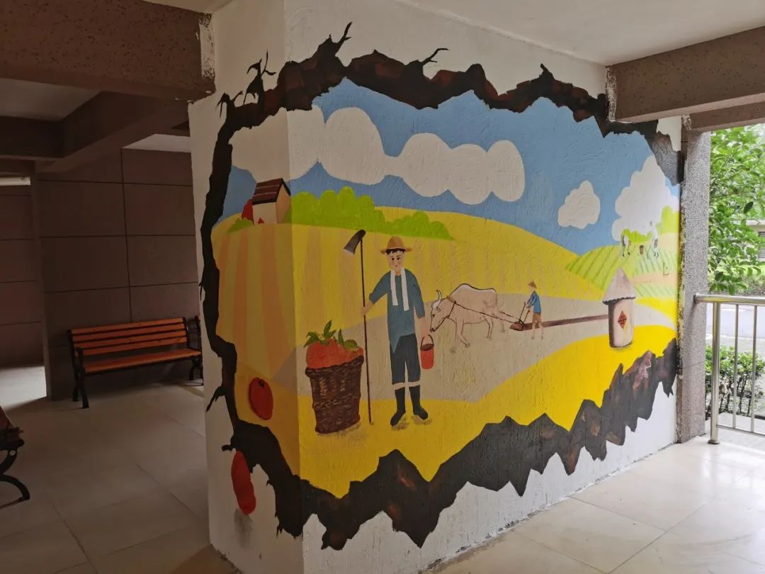 盈浦街道双桥社区结合地域风俗文化,利用楼道架空层和绿化带进行改造美化,打造3D立体墙画空间,多角度展示旧时乡村的生活风貌和农耕景象,提升楼道景观,打造社区特色文化氛围,引起社区居民情怀与共鸣,在赏心悦目的同时加强居民对社区认同感和凝聚力。