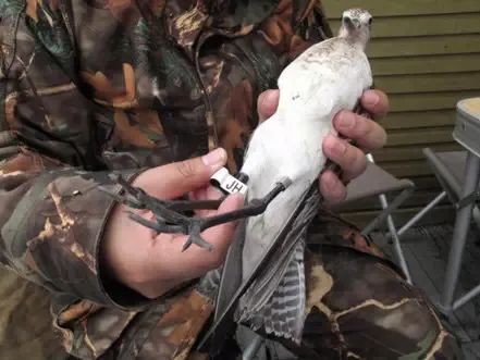 戴好鸟环之后,给鸟佩戴黑白两色旗标。