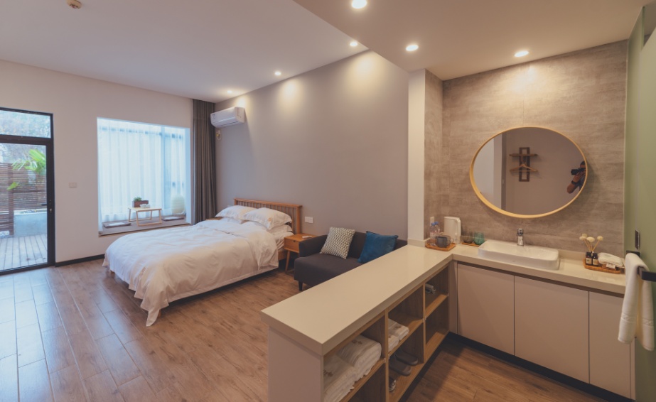 雅致的建筑与江南水乡融合一起,谱写出恬静淡雅的舒适环境。客房的装修现代简约,却又不失大气。民宿以灰、黑和原木色为主色调。华丽却又不显张扬。民宿同时配套餐厅、客厅、茶室、瑜伽馆露台等多样化的公共空间,远离都市的喧嚣,共同度过这休假的美好时光吧。