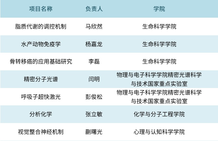 其中,生命科学学院3项,物理与电子科学学院精密光谱科学与技术国家重点实验室2项,化学与分子工程学院与心理与认知科学学院各1项。获批项目的研究领域涉及数理、化学、生命、信息、医学等5个科学部。
