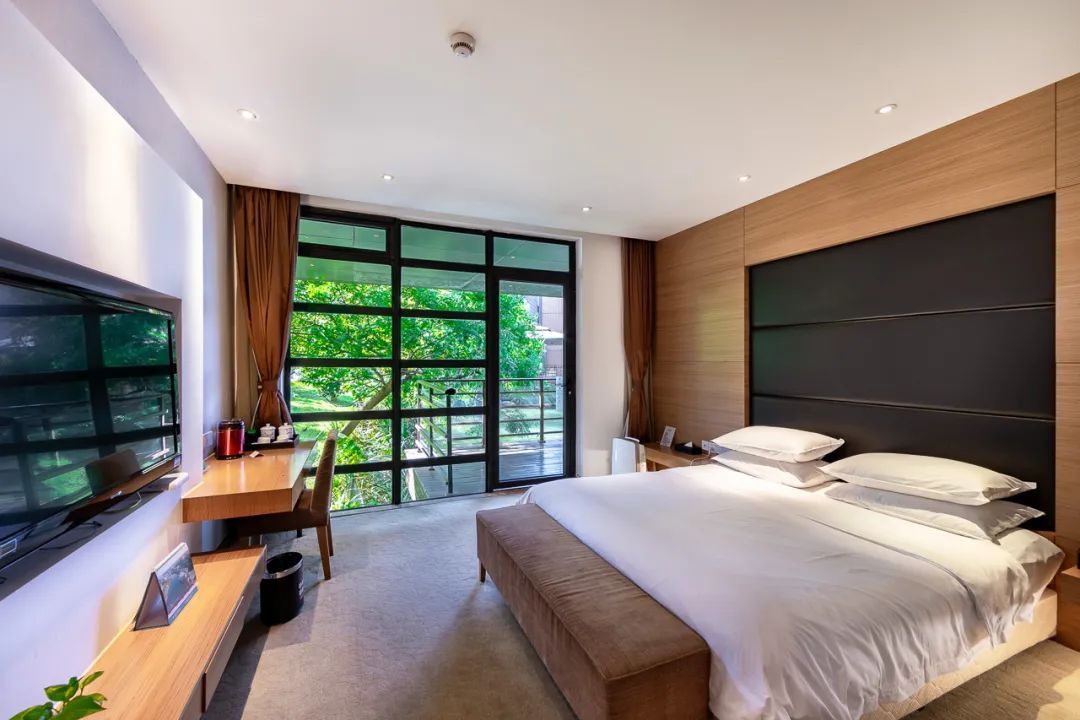 酒店针对不同景观推出林景和湖景系列客房,或藏于森林之中或立于湖泊之畔,推开窗,湖水就在脚下,岸边植物四季摇曳,一片绿意盎然。无论是小型团建还是朋友聚会,都是尊贵雅致的私密之选。