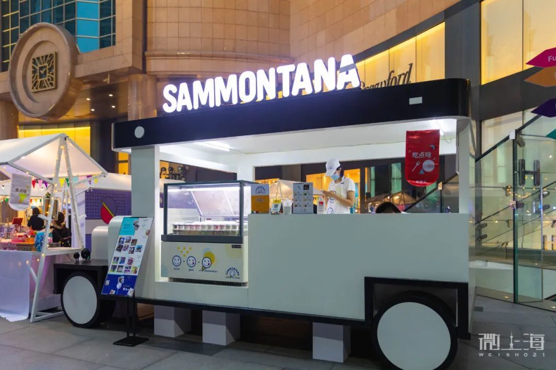 饰集右边的SAMMONTANA的冰激凌车出售各种各样的冰激凌口味,一定有款你喜欢的味道。