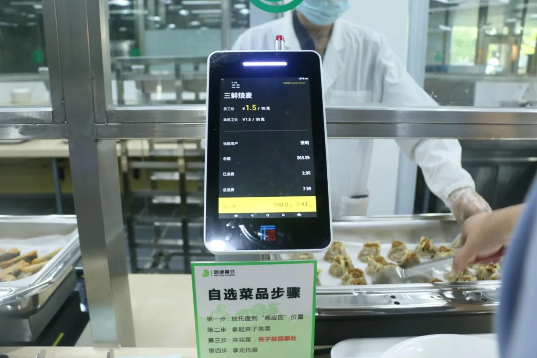“共享食堂”不仅装修现代化,而且还是金山首家“智慧餐厅”。食客张女士,通过自选菜品的方式,按需取完菜品之后,将托盘放入自动感应区,机器就自动根据取餐重量计费,随后,张女士通过“人脸识别”的方式付了款,整个过程不超过1分钟,而张女士选取的牛奶刀切馒头、豆沙春卷、小米粥一共才花费2.5元。