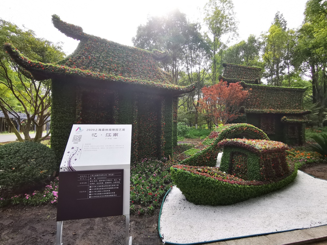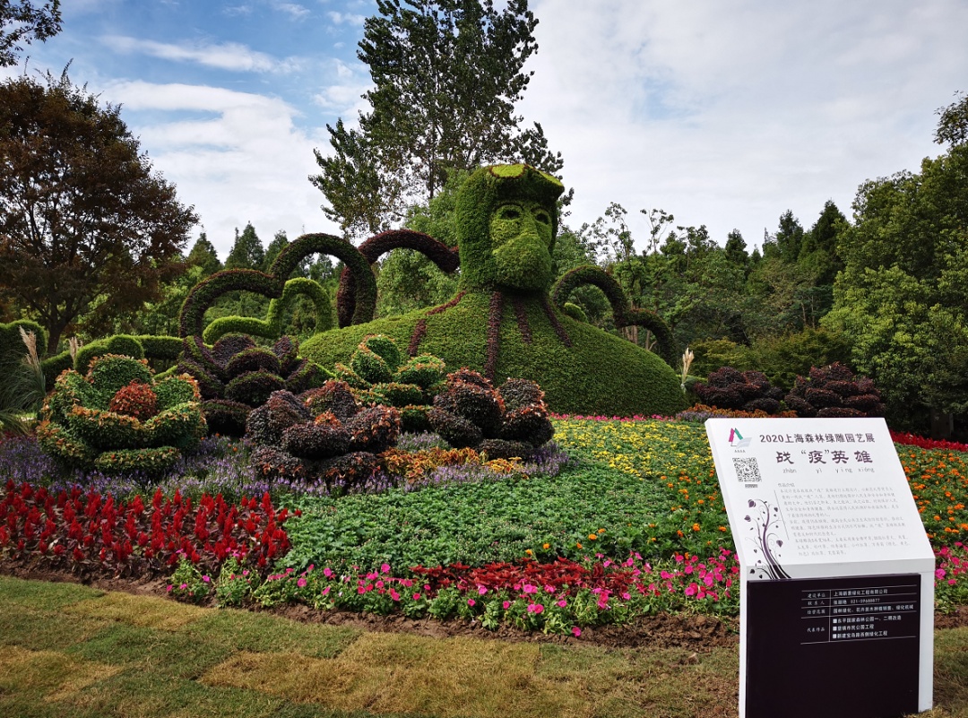 12件绿雕作品,用绿植造景,展现战“疫”英雄、忆·江南、圆恋梦2020、梦起·龙门、生态崇明蟹乐之道、家好月圆、礼献花博等不同的主题。