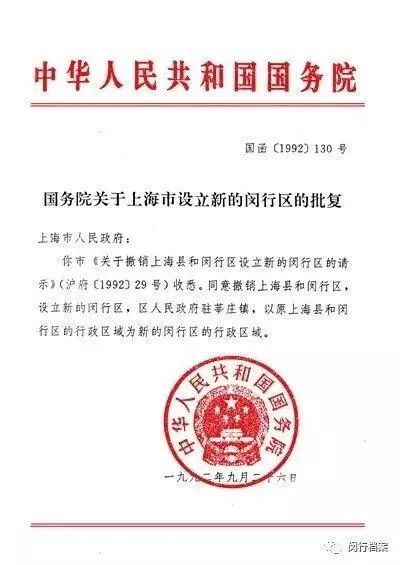 1992年9月26日,国函[1992]130号文件《国务院关于上海设立新闵行区的批复》下达上海市政府:“同意撤销上海县和闵行区,设立新的闵行区,区人民政府驻莘庄镇,以上海县和闵行区区域为新的闵行区的行政区域。”
