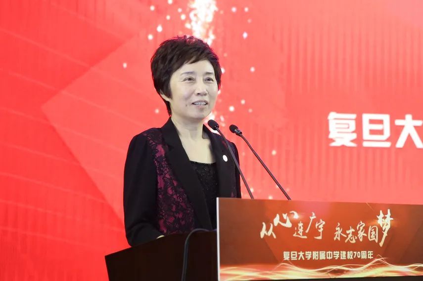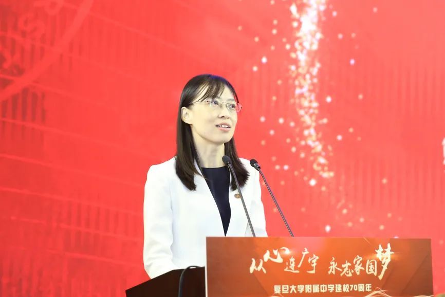 焦扬在讲话中代表复旦大学党委和全体复旦师生向附中全体教职员工、广大学生和校友送上祝福,向长期支持附中发展的上海市教委、杨浦区委区政府和社会各界表示衷心感谢。“回望历史,附中自诞生之初,就承载着为党育人、为国育才的红色基因。”她说,70年栉风沐雨、团结奋斗、诲人不倦、蓬勃发展,附中始终与百年复旦同向同行,始终站在基础教育改革潮头,始终坚持以人为本的办学理念,涵养从容大度、追求卓越的附中精神,打造了国内顶尖、蜚声中外的附中品牌,成为上海教育的一张靓丽名片。