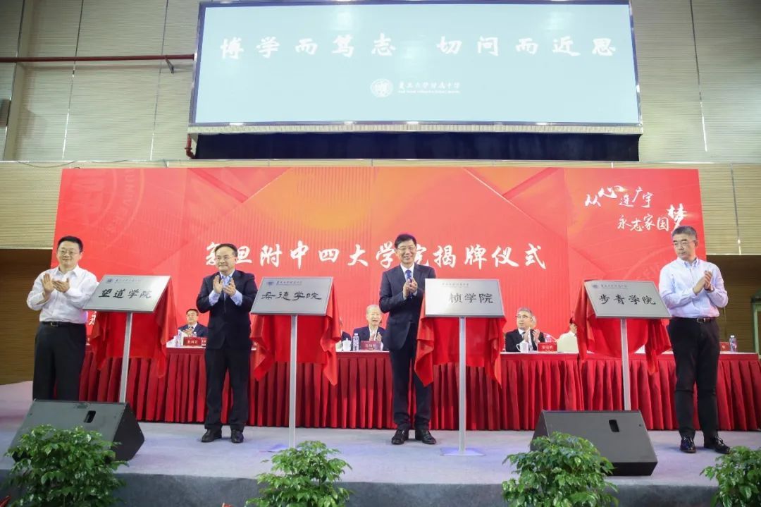 复旦大学党委书记焦扬出席大会并讲话。附中1960届校友、附中校友会荣誉会长,十一届全国人大常委、中国作协原党组书记、中共上海市委原常委、宣传部长金炳华,附中1965届校友、附中校友会会长,复旦大学、同济大学、中国人民大学原党委书记程天权等校友代表共同见证。上海市教育委员会主任王平,杨浦区委副书记、区长薛侃,复旦附中校长吴坚在大会上致辞。上海市教育委员会副主任倪闽景,上海市教育考试院院长、附中原校长郑方贤,复旦大学党委副书记、副校长周亚明,杨浦区副区长王浩为四大学院揭牌。复旦附中党委书记郭娟主持大会。