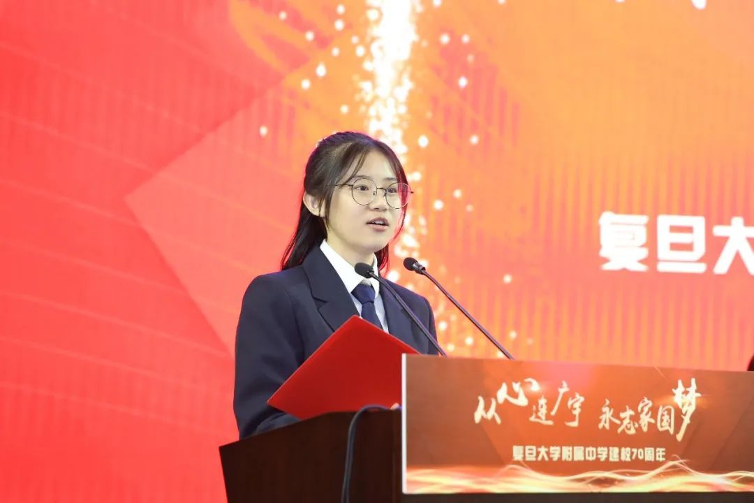复旦附中校长吴坚在致辞中回顾了学校70载办学历程,并指出,复旦附中在坚持追求卓越、不断开拓创新的办学历程中从未动摇过为党育人、为国育才的神圣信念。他表示,复旦附中曾经开创过许多个基础教育的第一,今天依然砥砺前行,努力进取,保持并发扬优良传统,坚持正确的育人导向,探索新时代中国特色社会主义教育发展的规律,为习近平总书记寄语教育工作者的三个育人根本问题交出复旦附中的答卷。“七十正青春,70岁的附中永远是十七。”他祝愿毎一位复旦附中人弘扬光荣历程,铭记时代使命,继往开来,勇创一流,在此世界大变革之际谱写属于中国人的崭新篇章。