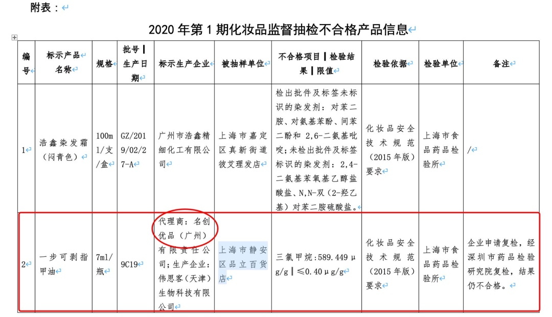 据上海药品监督管理局网站消息,9月23日该局发布了《2020年第1期化妆品监督抽检质量公告》。公告显示,名创优品(广州)有限责任公司代理的一款名为“一步可剥指甲油”的化妆品,检出三氯甲烷含量高达589.449μg/g,是国家标准限值0.40μg/g的1400多倍。上海药监局披露的信息显示,该企业申请复检,经深圳市药品检验研究院复检,结果仍不合格。
