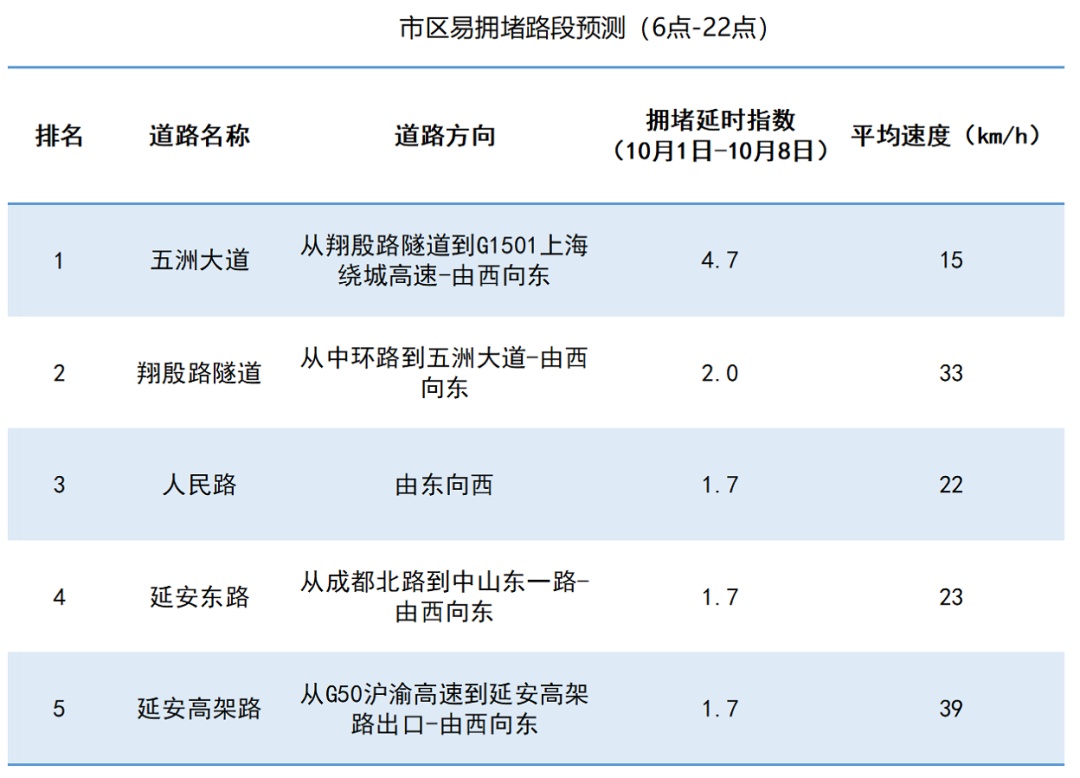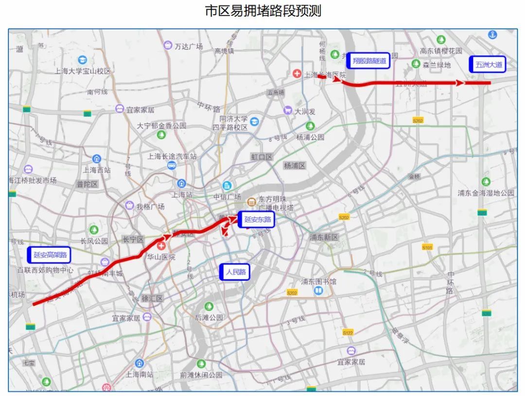 市区方面,预计节假日期间,市区五洲大道、翔殷路隧道、人民路、延安东路和延安高架路容易发生拥堵。