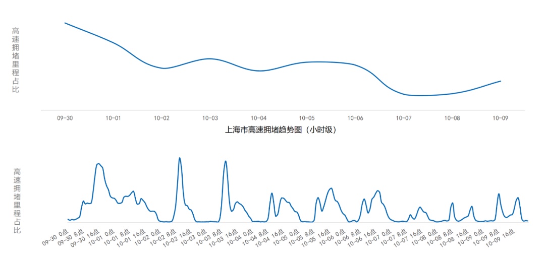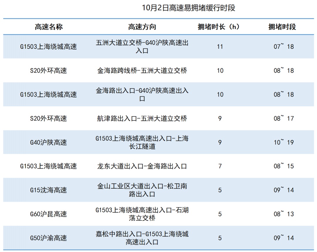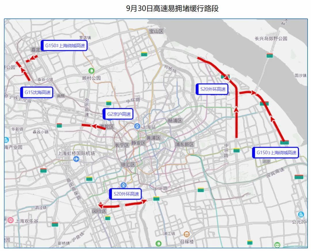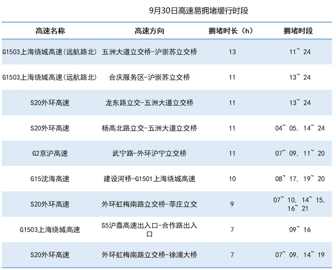 而合庆服务区至沪崇苏立交桥、龙东路立交至五洲大道立交桥、杨高北路立交桥至五洲大道立交桥、武宁路至外环沪宁立交桥,在9月30日拥堵的时长都可能达到11个小时以上。