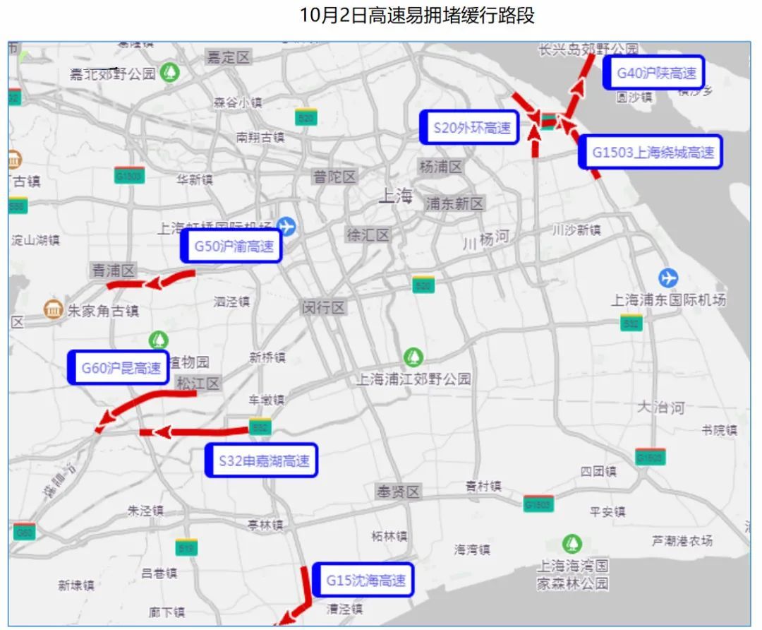 根据高德地图,交通大数据预测,十一期间上海市出城易拥堵缓行的高速主要是G1501上海绕城高速(远航路北)、 S20外环高速、 G2京沪高速等高速的部分路段。