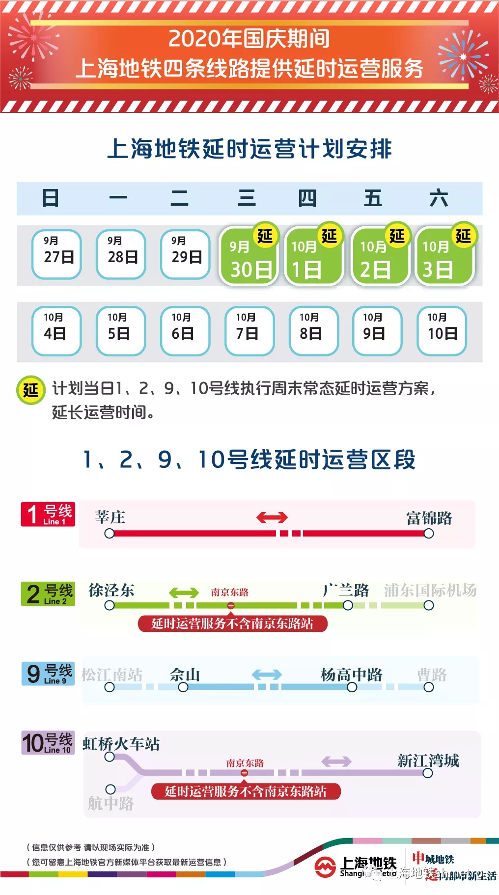 为缓解中心城区夜高峰休闲、购物客流密集的压力,并最大限度地满足乘客节日出行的需求,9月30日至10月3日连续四天,上海地铁1、2、9、10号线计划执行周末常态延时运营方案,延长运营时间。