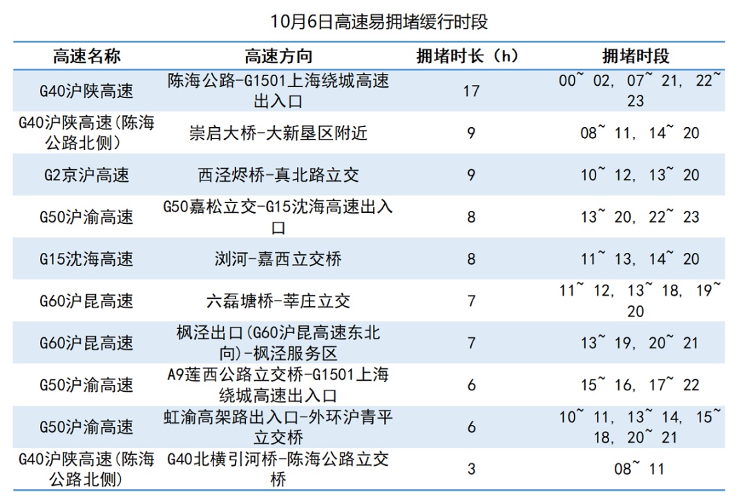 其中陈海公路至G1501上海绕城高速出入口,10月6日预计将拥堵17个小时,另外崇启大桥至大新垦区附近、西泾烬桥至真北路立交、 G50嘉松立交至G15沈海高速出入口等路段预计拥堵情况都比较严重。
