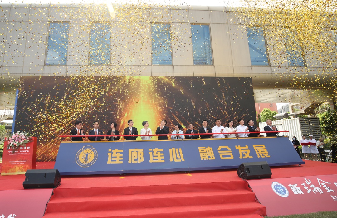 连廊连心,标志着瑞金医院两院区迎来了融合发展的崭新时代,瑞金医院原党委书记陈淑瑾,原院长、终身教授李宏为,原院长朱正纲,中国工程院院士陈赛娟为“新瑞金人”代表佩戴新胸牌。