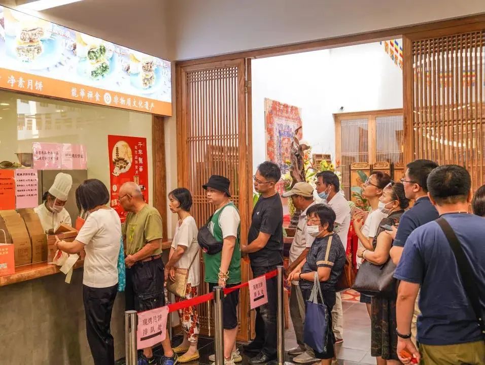 而龙华寺内的素斋总店,大排长龙的架势在中秋前夕每天都在上演。