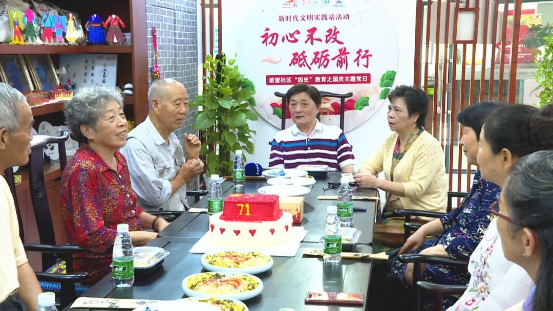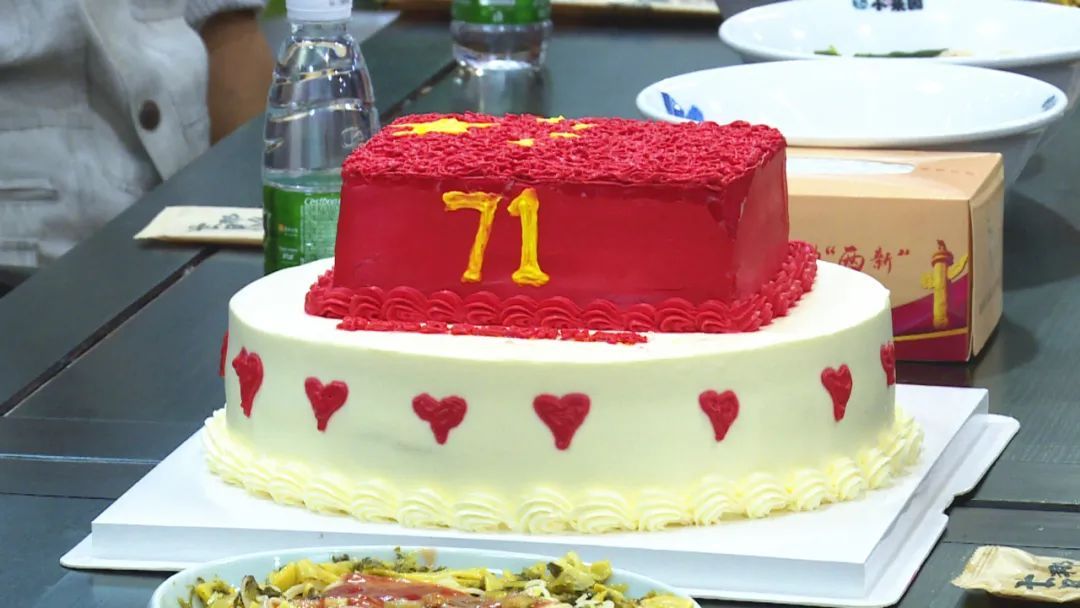 社区工作者还专门为老人定制了一个“喜迎国庆71周年”大蛋糕。现场,一名老人不仅名字与国庆相近,生日也与国庆相邻,大家热情地向他送上祝福,让他乐得合不拢嘴。
