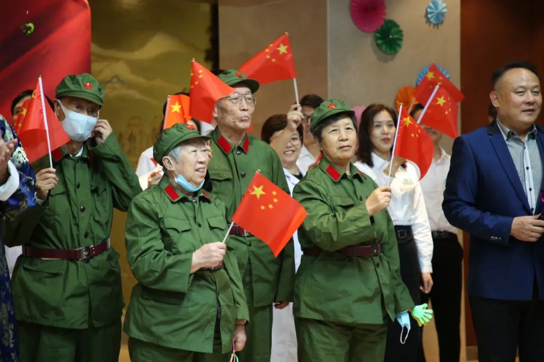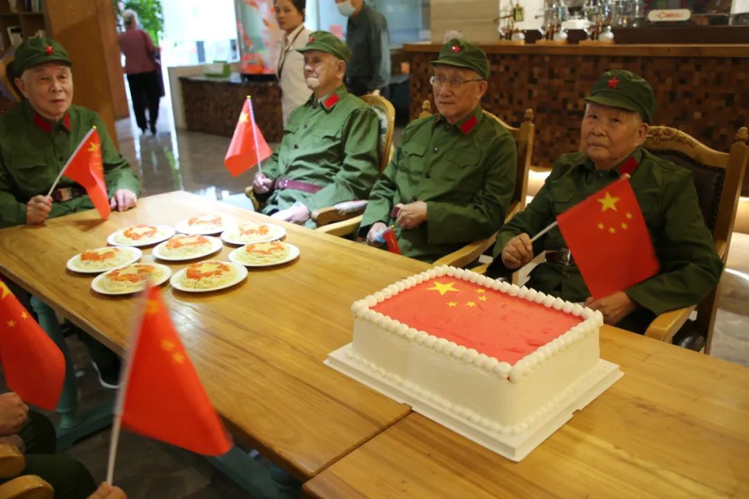 在新成路街道颐康家园养老院,退伍军人重新穿上军装,围坐在印有国旗图案的蛋糕和五角星图案的“国庆面”前,高声唱起《歌唱祖国》。