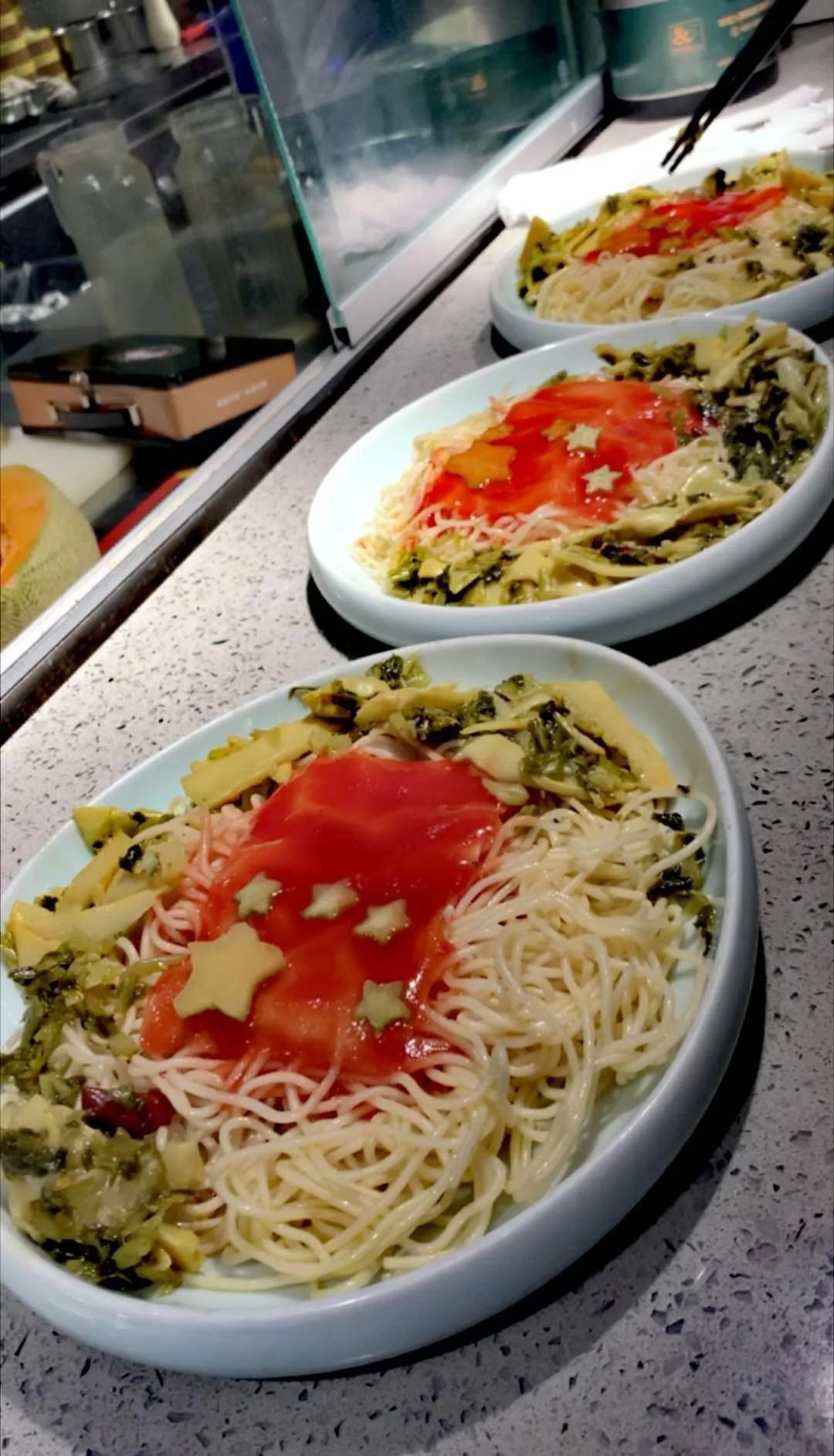 这些“国庆面”由中信泰富万达广场的两家餐饮商户免费提供,摆盘都经过精心设计:有的用红萝卜打底,做出红旗和“71”元素;有的用哈密瓜点缀出“五角星”图案。为了迎合老年人的口味,厨师还特意将面煮得烂一些,并配了咸菜、酸笋等开胃菜。