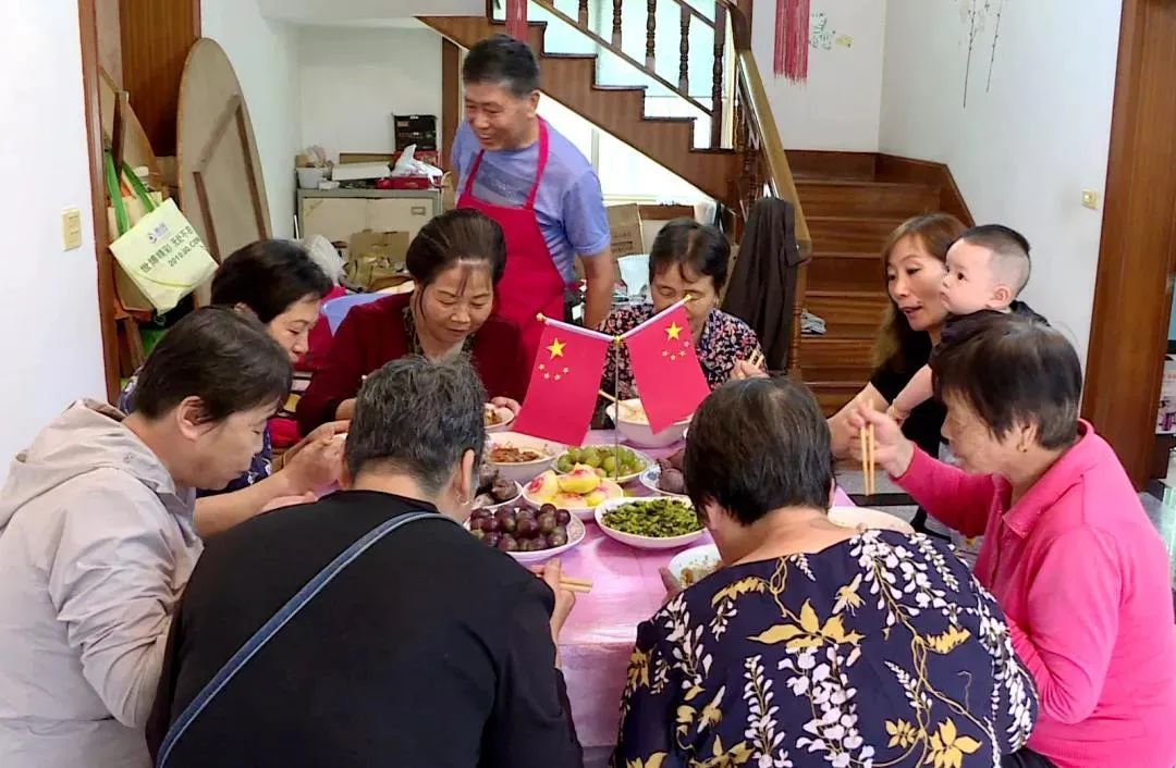 中午时分,安亭镇陆巷社区的居民印其兴家中欢声笑语,10位居民正有条不紊地张罗着“国庆面”。厨房里,印其兴负责煎蛋、烧大排、下面,其他居民帮着一起煮汤、摆盘……餐桌上早早摆放好了国旗、月饼、芋艿、咸菜炒毛豆、水果等,浓浓的喜庆氛围充满整间屋子。