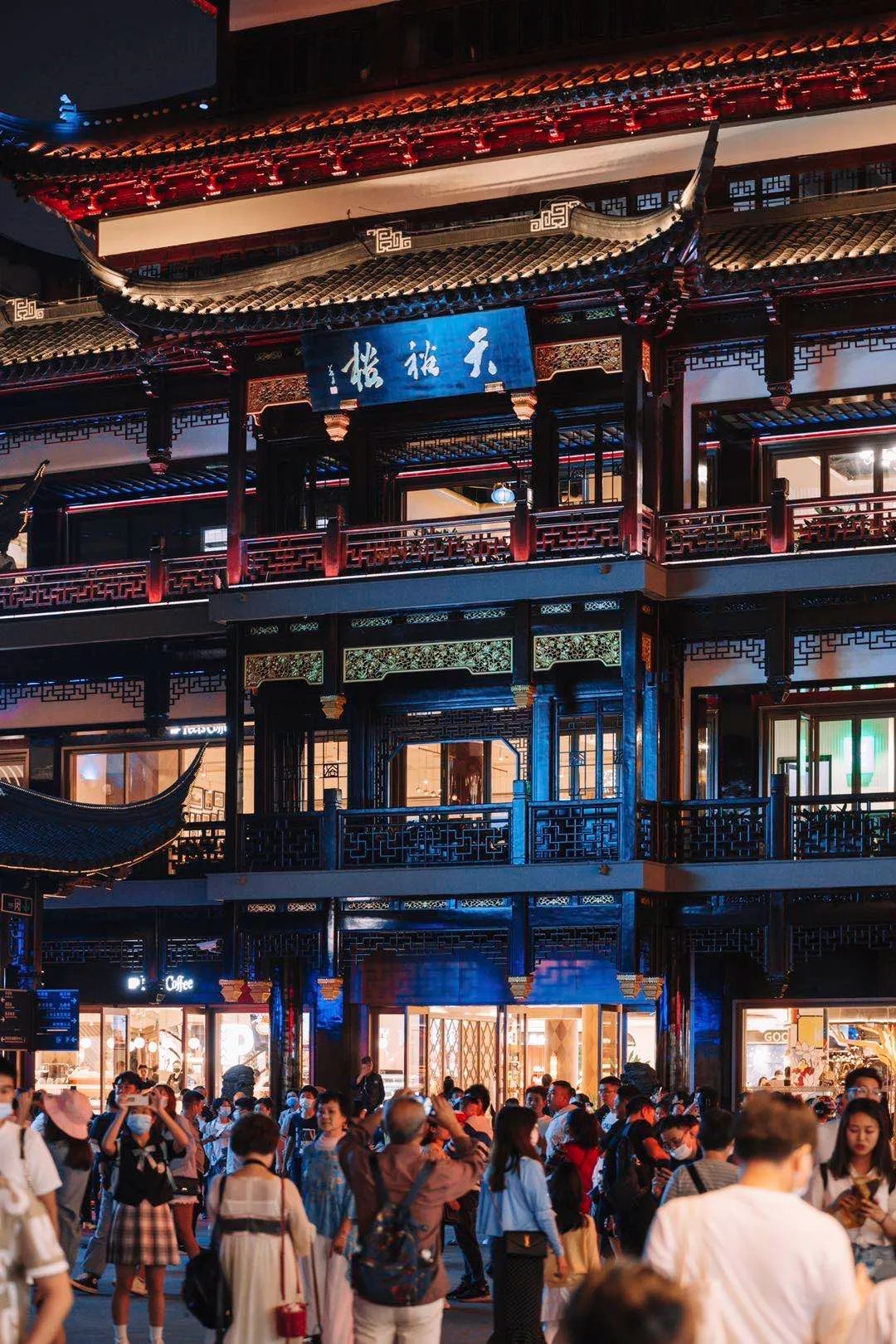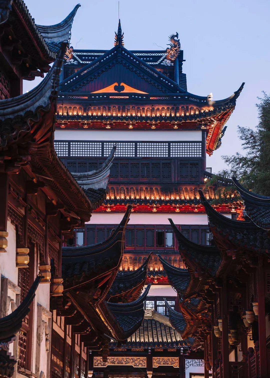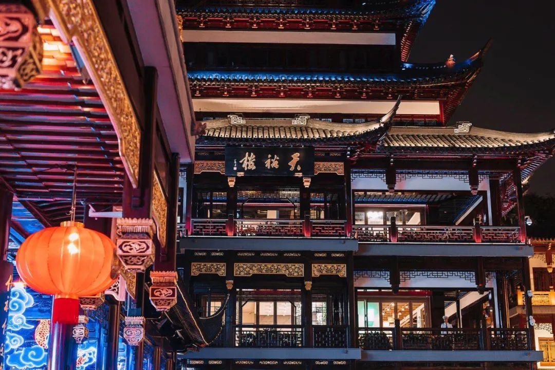 天裕楼是豫园的拍照圣地。摄影爱好者都知道,想要拍好天裕楼,有两个点位必不可少。一是中心广场的华宝楼前,自东向西地捕捉天裕楼的全景,特别是傍晚,借着余晖,巍峨秀挺的楼宇就入画了。