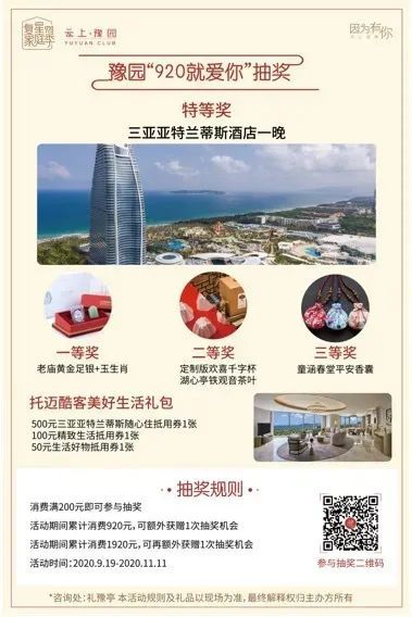 扫码注册会员还可以领取价值168元的“豫园乐活福袋”;参与“920就爱你”抽奖活动,还有机会获得三亚亚特兰蒂斯酒店客房1晚。
