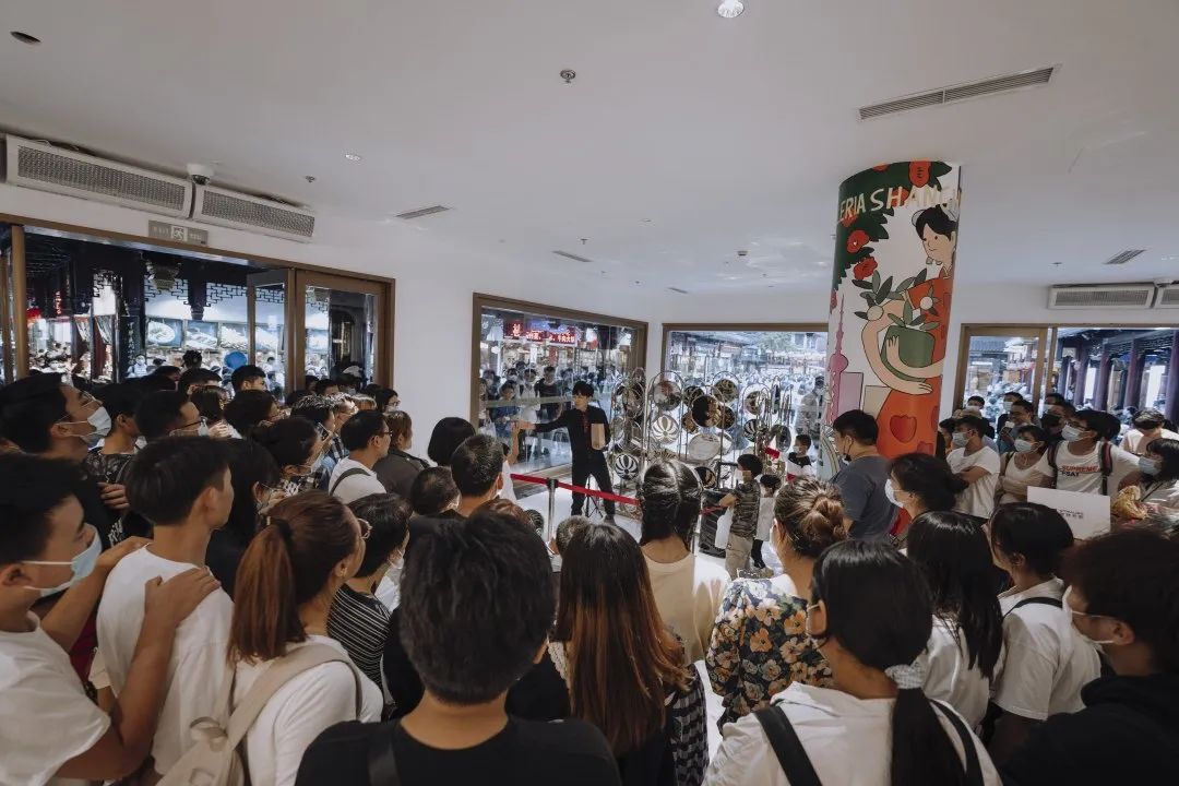 那是上个世纪30年代,流行一时的ARTDECO风格,也是海派味道的符号化提炼。以石库门拱门为灵感的金属装置,是座椅也是打卡点;360度翻转的镜面,层垒出一个大型“衣架”,是创意,也是景观。当代上海、上个世纪30年代上海,在明清式的建筑里融汇。