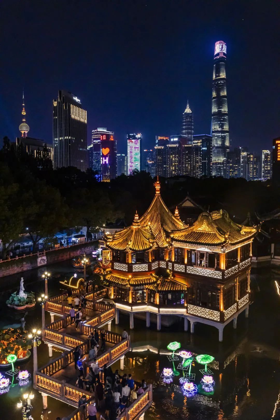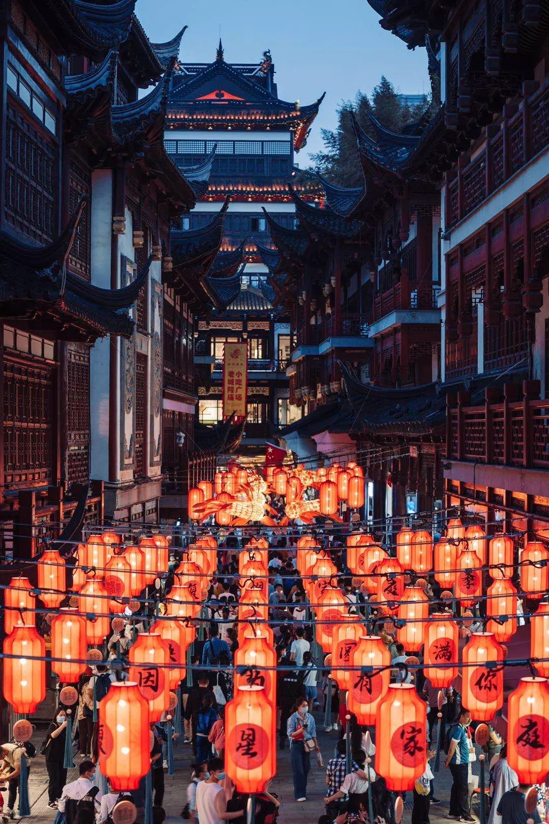 二要站在豫园内环的凝晖路上,凝晖路是豫园的千灯街市,自北向南地站定,微微蹲低,顺着高悬的伞状、龙鱼状灯彩将天裕楼的一侧檐角带入,构图完美!