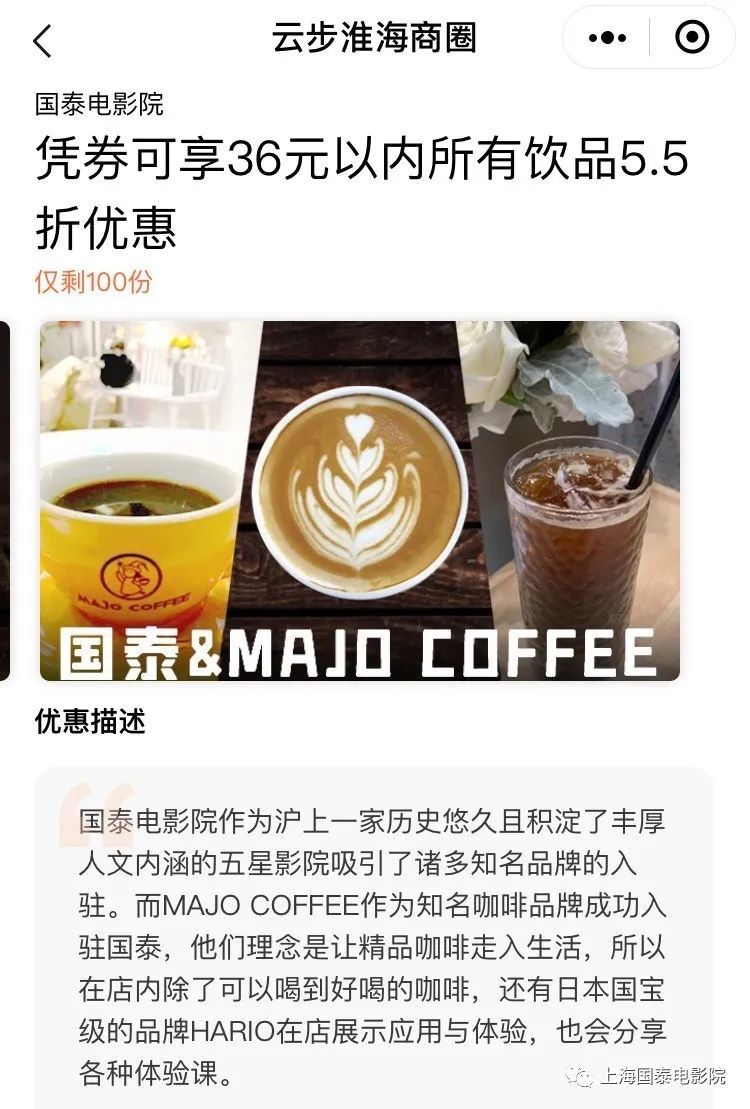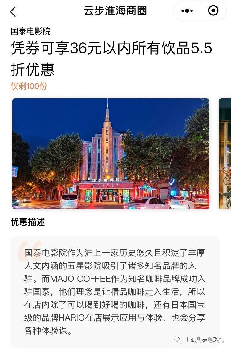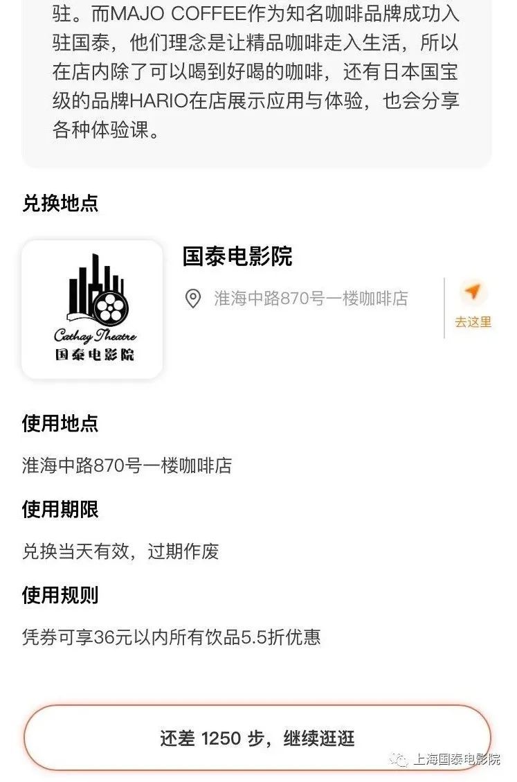 关注“云步淮海商圈”小程序,通过小程序累计在淮海中路商圈实时行走的步数,用于兑换国泰电影院内MAJO COFFEE饮品的优惠折扣哦~