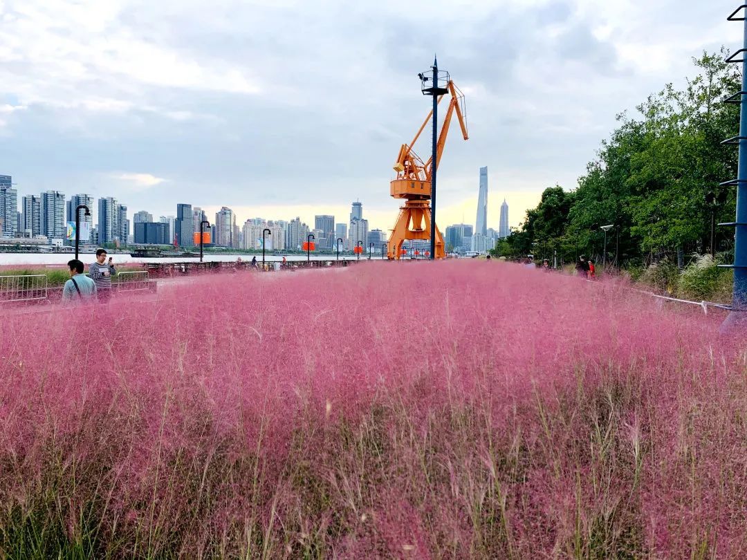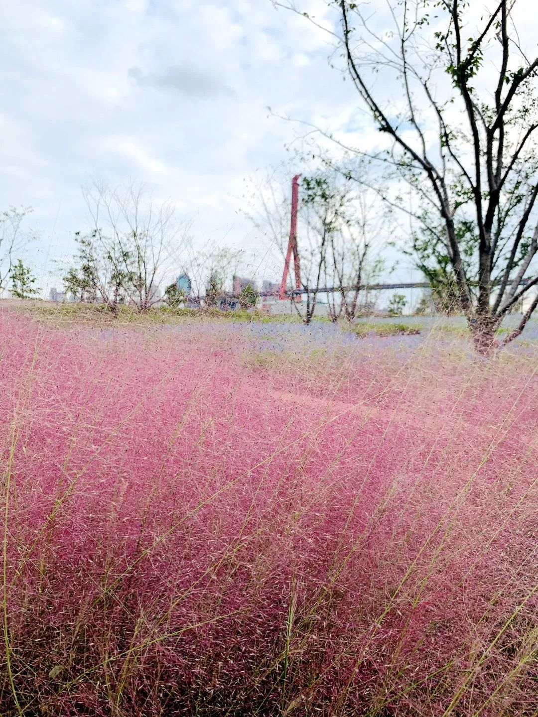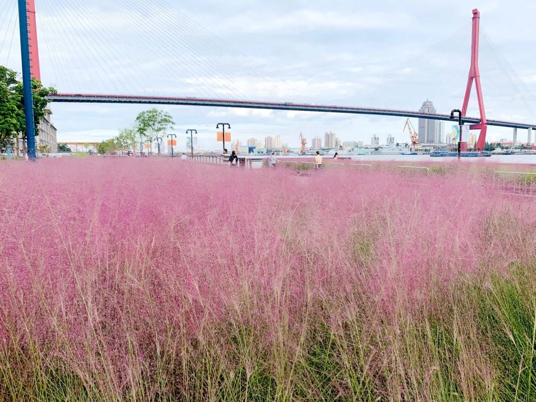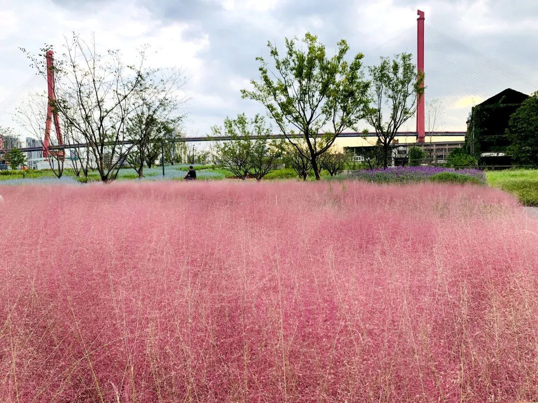 杨浦滨江岸线上粉黛乱子草的集中观赏地为杨浦大桥下(西侧)及国棉九厂地块的印记花园。漫步其间,仿佛徜徉于一片粉红海洋之中,宛如童话般浪漫唯美,随手一拍就是大片。