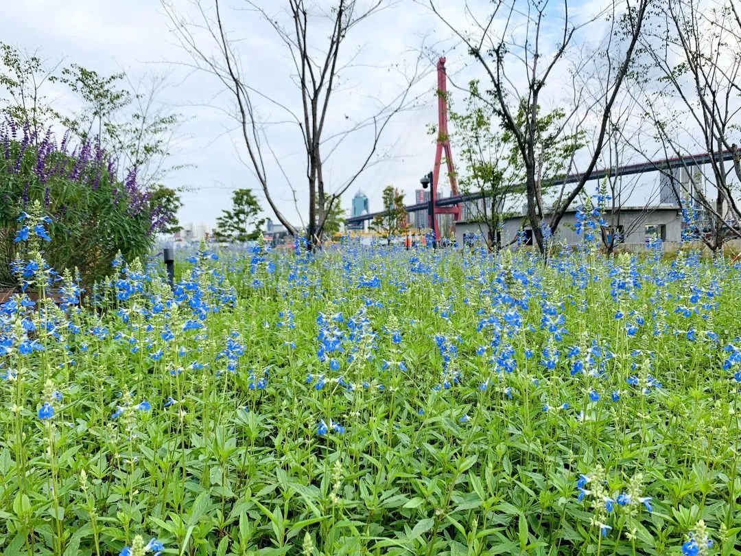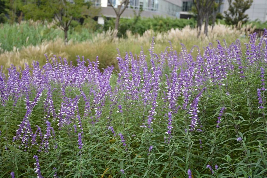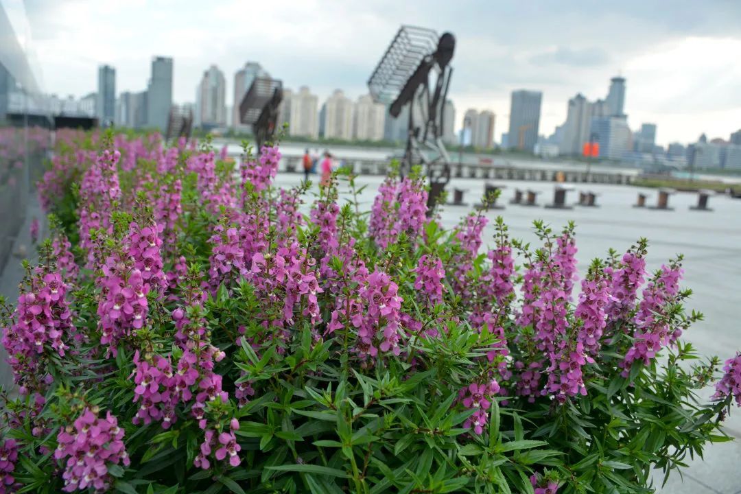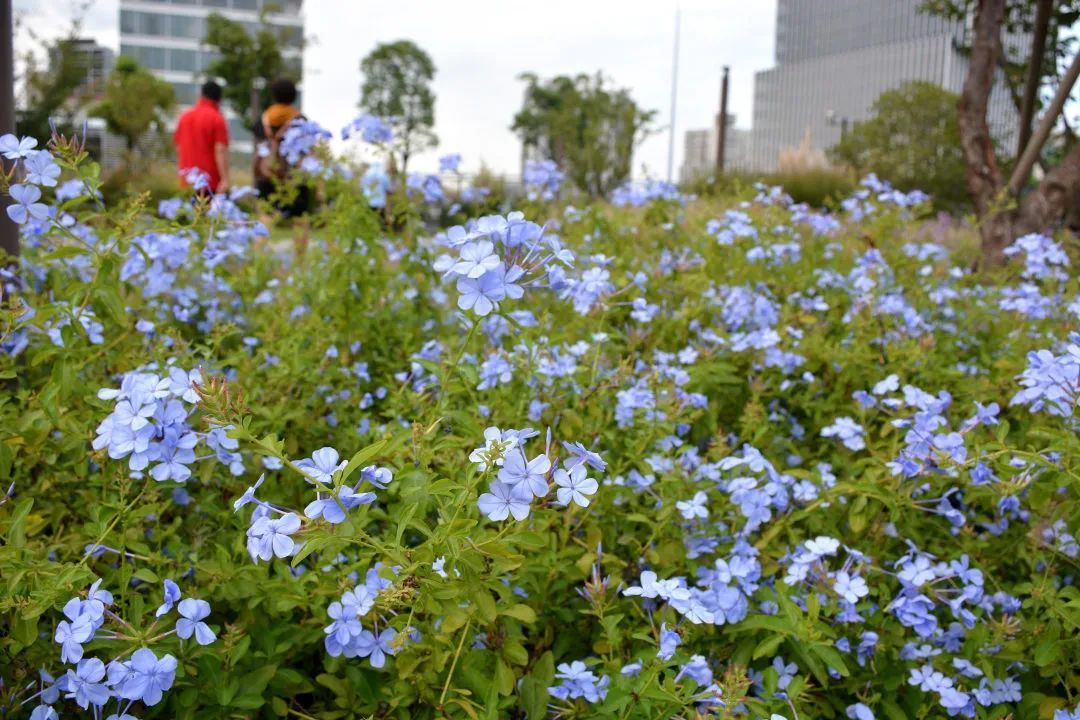 秋天不止有粉色与金黄,这里的鼠尾草、细叶美女樱、香彩雀、蓝花丹等花卉也已开放,将滨江岸线妆点得更为多彩。
