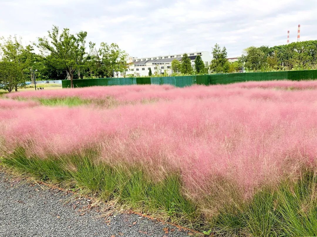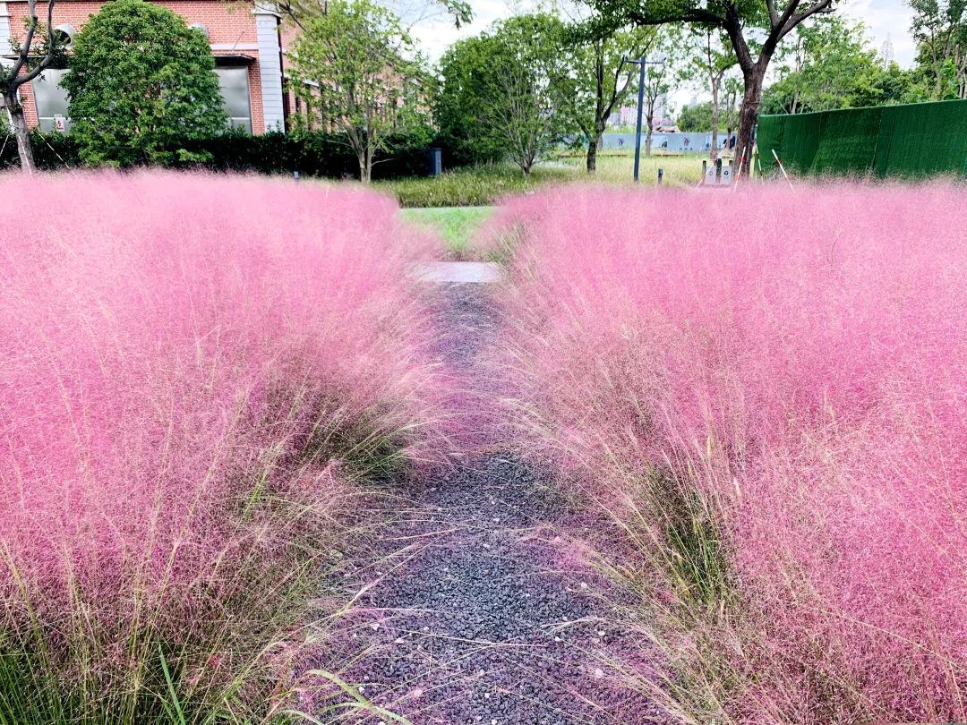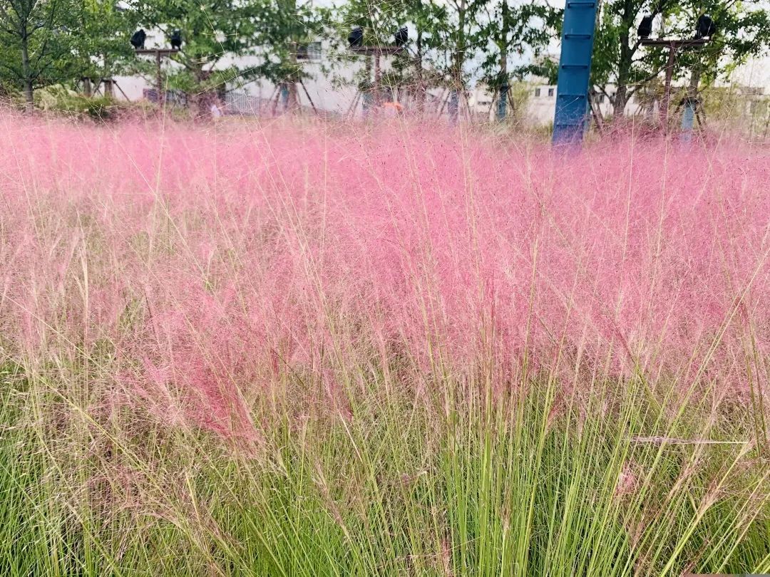 粉黛乱子草的花期一般在每年的9-11月之间,开花时,绿叶为底,粉紫色花穗如发丝从基部长出,成片种植可呈现出粉色云雾海洋的壮观景色。