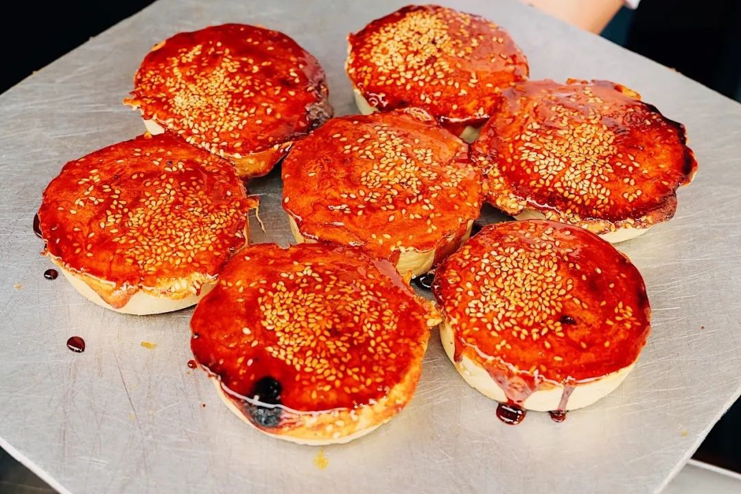 因为色泽如蟹壳背一样,所以称为“蟹壳黄”。用油酥面加酵面制坯,做成扁圆形饼,饼面粘上一层芝麻,贴在炉壁上经烘制而成。馅料有咸有甜,咬一口脆到掉渣,老嗲额。