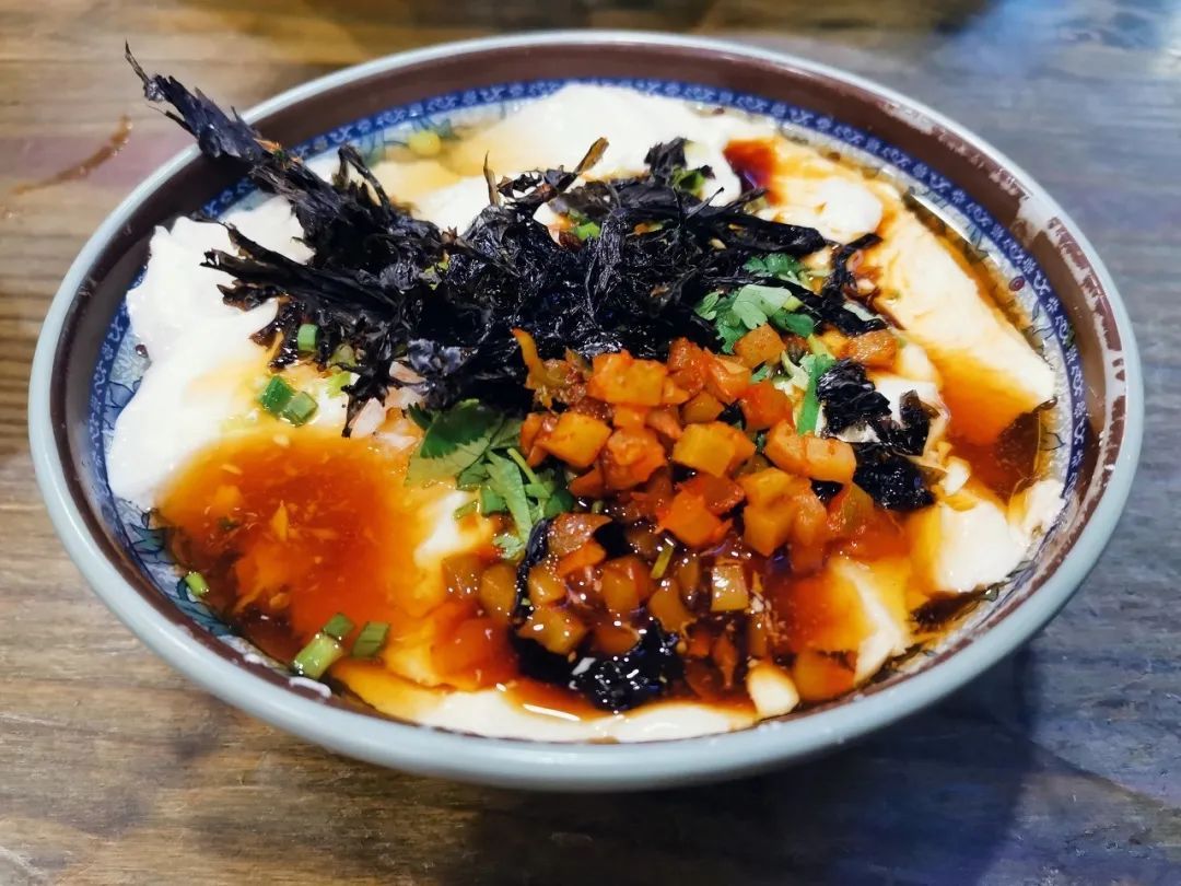 一碗光滑的“白色豆腐”,色泽洁白,滑嫩爽口,鲜咸微甜,还加了不少紫菜虾仁榨菜等作料,自己动手拌一拌,好吃!
