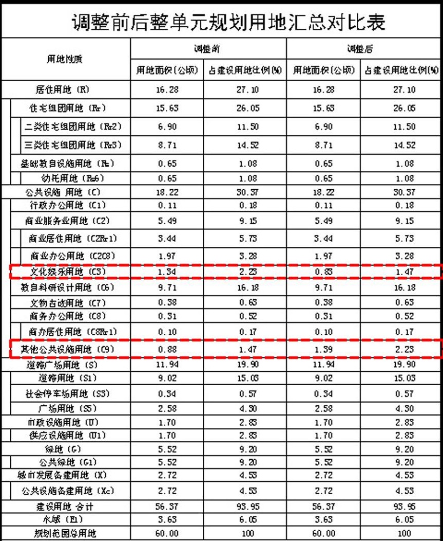 主要调整内容为:C1-03地块用地性质由文化用地调整为其他公共设施用地,容积率和建筑高度不变。