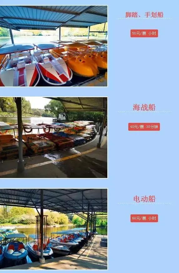共青森林公园内有三处提供划船服务,分别是流芳桥边上、涛声桥边上和盈滨轩对面的盈湖泛舟水域,这三处提供的划船服务也各不相同。