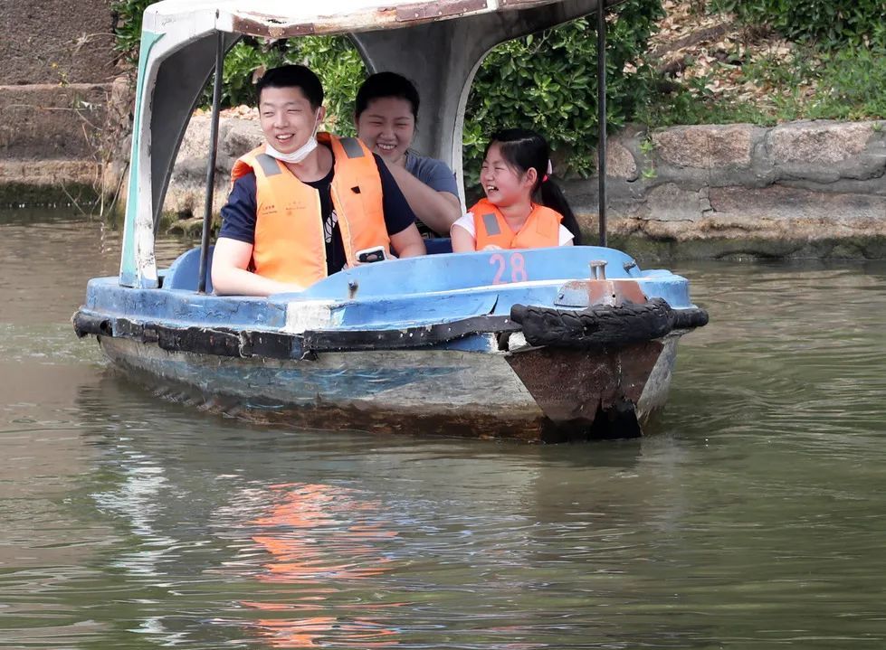 一家人其乐融融地水上泛舟,
