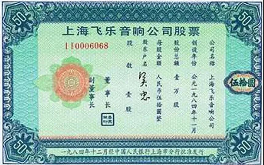 1984年7月,上海颁布了一个地方性法规《关于发行股票的暂行规定》,上海飞乐电声总厂抓住机遇,成了第一个吃螃蟹的。就在这一年的11月14日,经人民银行上海分行批准,由上海飞乐电声总厂、飞乐电声总厂三分厂、上海电子元件工业公司、工商银行上海市分行信托公司静安分部发起设立上海飞乐音响股份有限公司,向社会公众及职工发行股票。总股本1万股,每股面值50元,共筹集50万元股金,其中35%由法人认购,65%向社会公众公开发行。飞乐音响成为上海市第一家股份制企业,也是上海市首家向社会公开发行股票的公司。飞乐音响股份公司这次发行的股票,没有期限限制,不能退股,但可以流通转让,这可以说是我国改革开放新时期第一张真正意义上的股票。武夷路174号的飞乐音响公司实现了我国证券市场从无到有——零的突破。发行股票的那天,热心的市民早早来排队购买股票,认购队伍排成了一眼望不到头的长龙,盛况空前。第二天,《新民晚报》在头版中心偏左的位置,发表了关于飞乐音响开业的报道,全文将近500字。主标题为“接受个人和集体认购股票”。报道导语为:本市出现一家接受个人和集体自愿认购股票的新型公司——上海飞乐音响公司。它对社会发行股票一万股,每股五十元。飞乐音响公司就此一举成名天下知。股民们习惯地把飞乐音响公司称之为“小飞乐”。