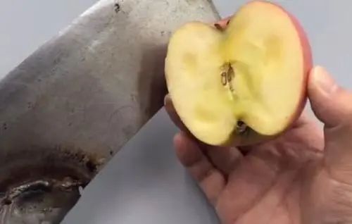 因为苹果中含有柠檬酸,我们切开半个烂苹果,用它来擦拭刀具,可以使刀具变得非常的光亮,还能够去除刀具上的油渍,擦拭完后我们只是用清水冲洗一下就可以了。