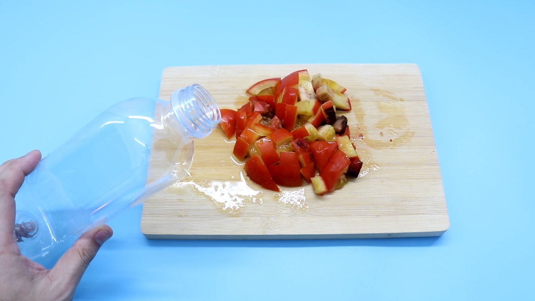 然后准备一个塑料瓶,把切碎的西红柿装起来。在这里需要注意的是一定要使用塑料瓶,不要使用玻璃瓶。因为在发酵的过程中会产生气体,使用玻璃瓶会存在着一定的危险系数。