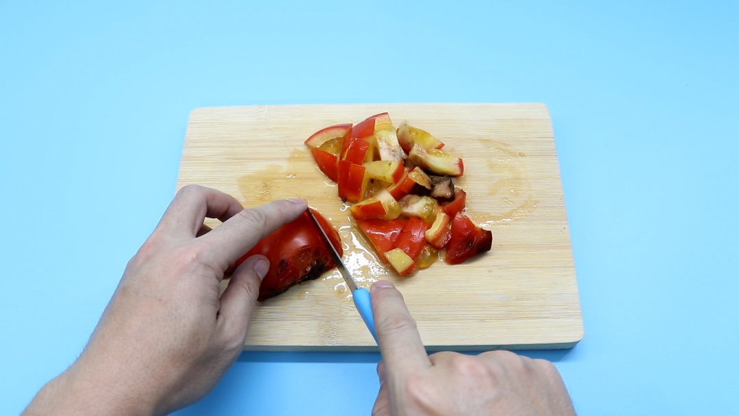 首先,我们可以把烂掉的部分切割掉,剩下相对完整的西红柿切成小碎块。