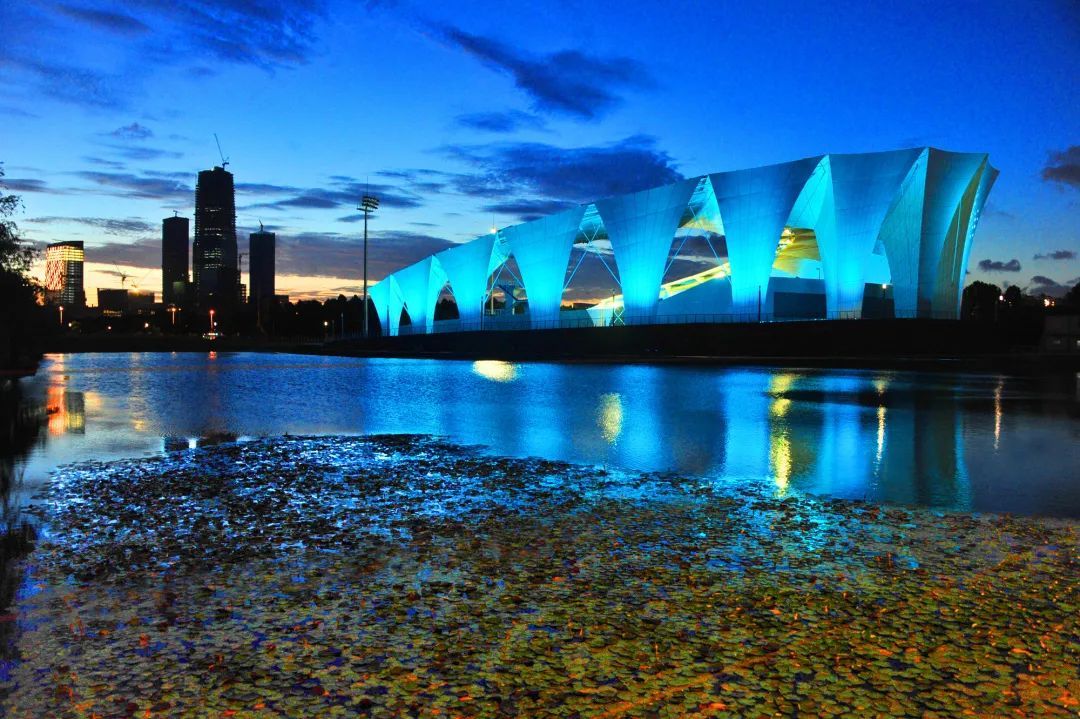 建筑宏伟大气,造型优美飘逸,充分体现了水的灵性和动感,是上海新十大地标建筑之一。当夜幕降临,中心的建筑外墙亮起橘红色的霓虹灯,橙黄色的五角星洒满墙体,与湖面的倒影交相辉映。