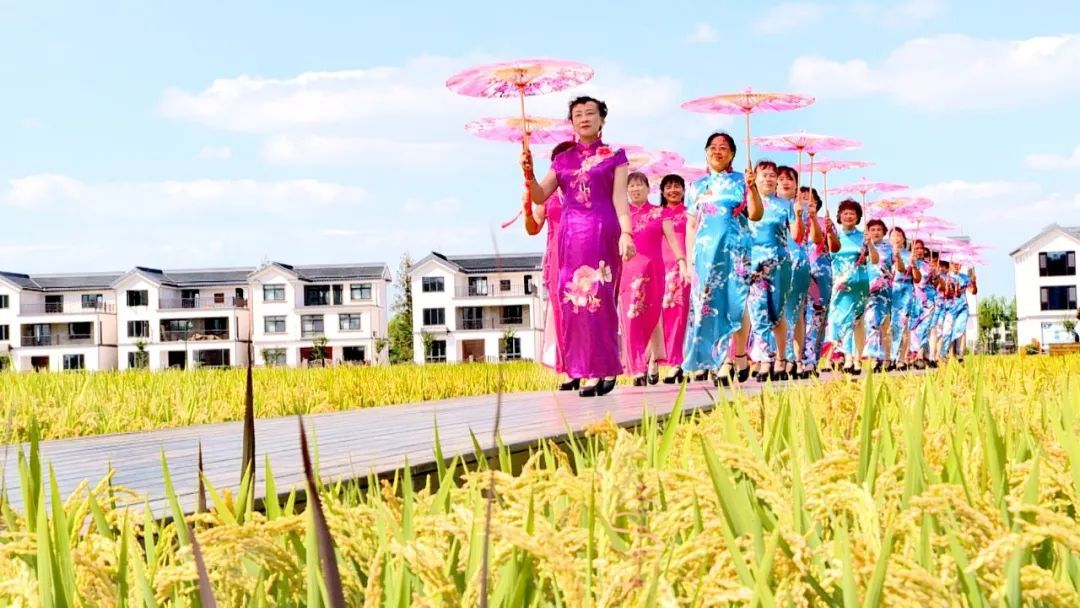 “年轻的时候在田里务农,每天一身汗两脚泥。那个时候怎么想得到,我们农家女人也能穿上旗袍和高跟鞋,过上小康生活!”队员沈杏娟说,她们自发组织了这场稻田旗袍秀,在美丽乡村里展现风姿,用传统文化表达对祖国的祝福。