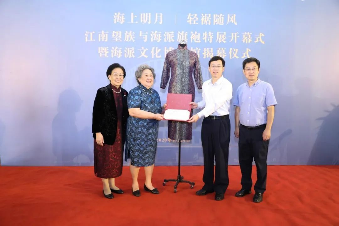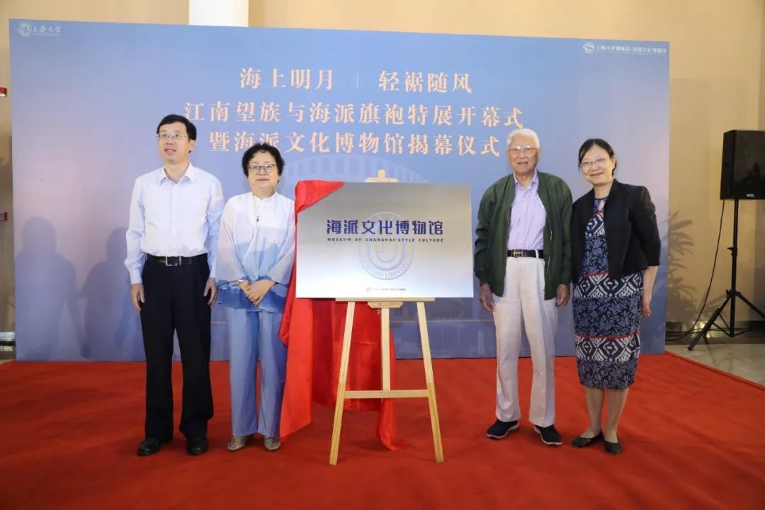 仪式上,徐景灿、宋路霞代表上海老旗袍珍品馆,向上海大学博物馆捐赠百件荣氏家族旗袍。段勇、陈东、李伦新、施彤为海派文化博物馆揭幕。