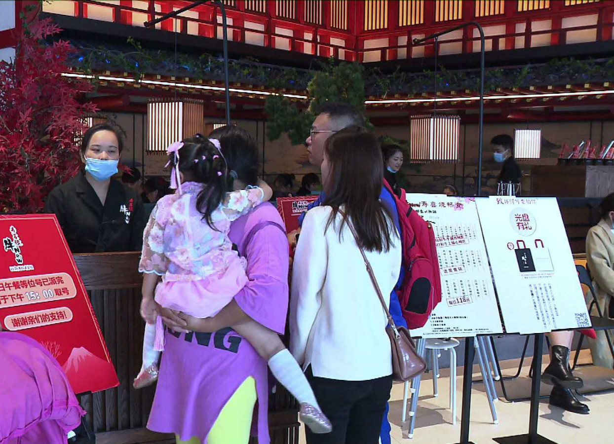 让顾客“有的拍”“有的听”“有的吃”“有的玩”,假期期间,南翔印象城MEGA策划了首届微旅游节。今天中午12点左右,商场内各家餐厅门口早已排起“长龙”,有些商家甚至摆出“客席已满”的提示牌。记者随机找了3家不同类型的餐厅取号,等位均在30桌以上。“我11点来的时候,前面就排了17桌。”带着一家老小来吃饭的高先生说。
