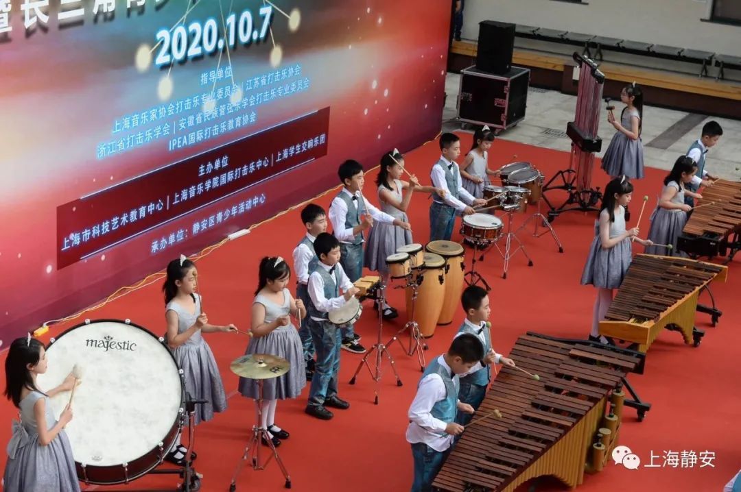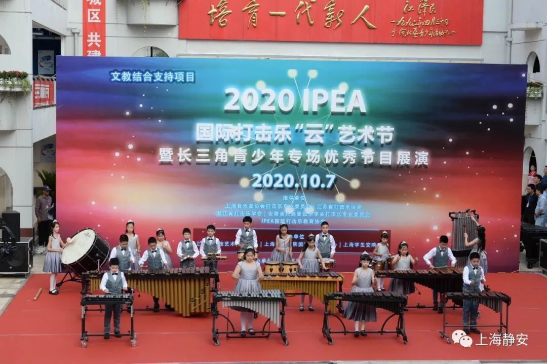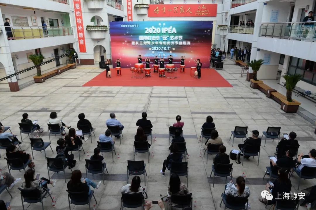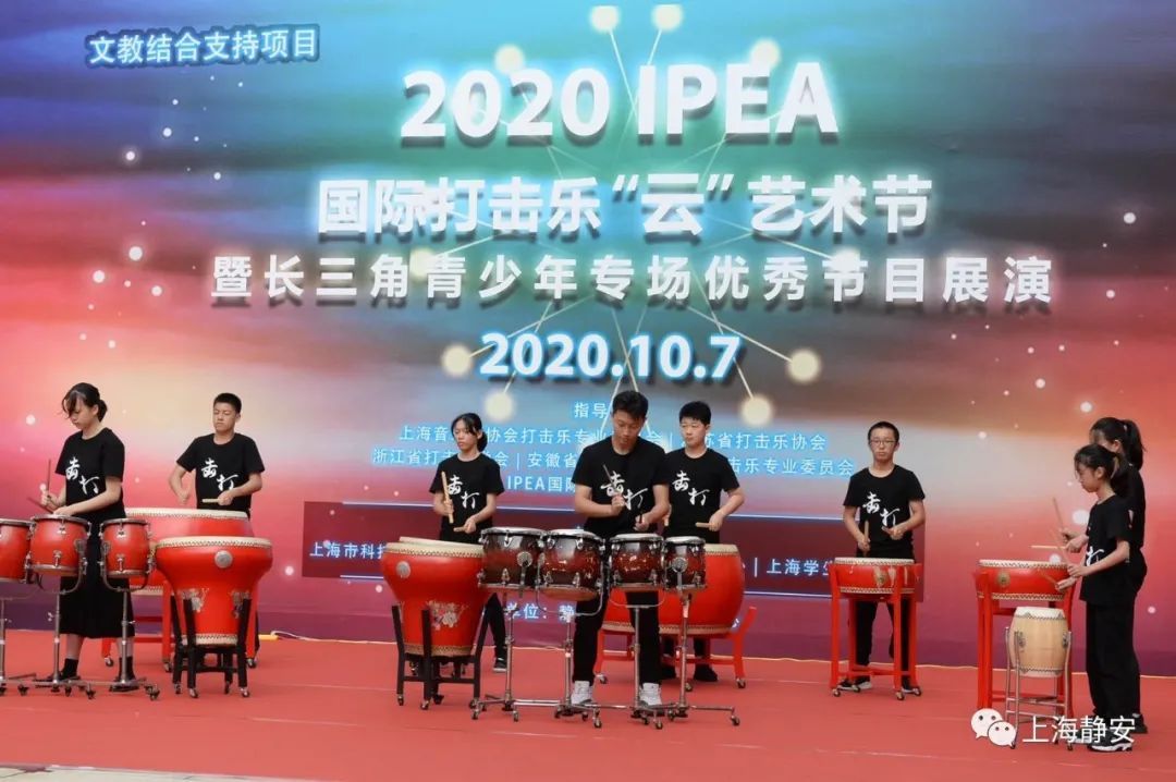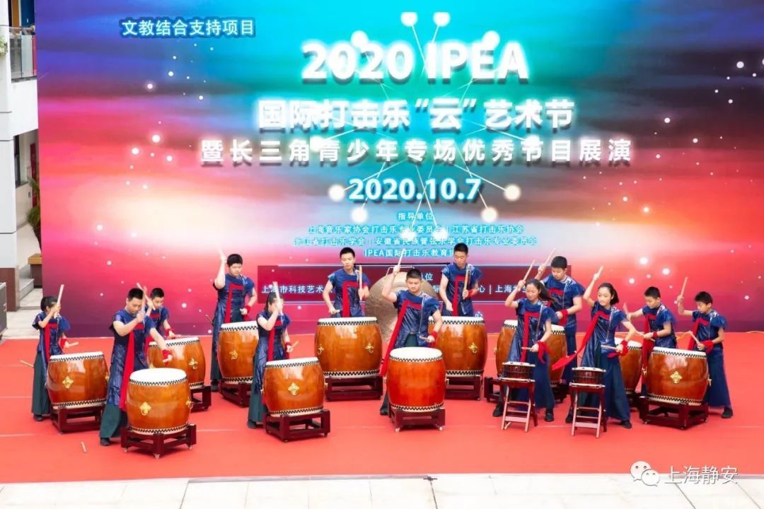 10月7日下午,阳曲路上的静安区青少年活动中心广场上鼓乐喧天,“2020年IPEA打击乐‘云’艺术节暨长三角青少年打击乐优秀节目展演活动”在此热闹举行,数以千计的师生通过线上直播平台或来到演出现场,共同欣赏这一视觉盛宴。