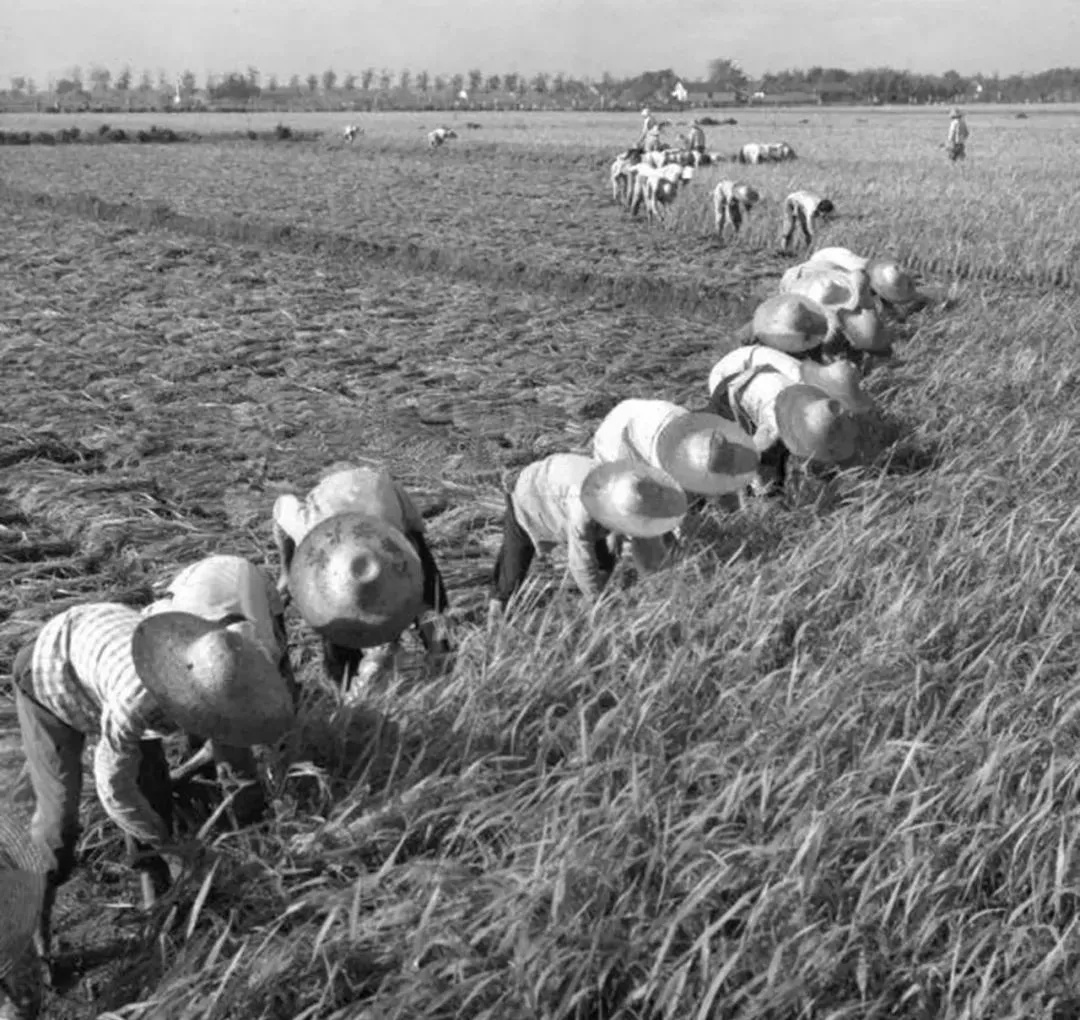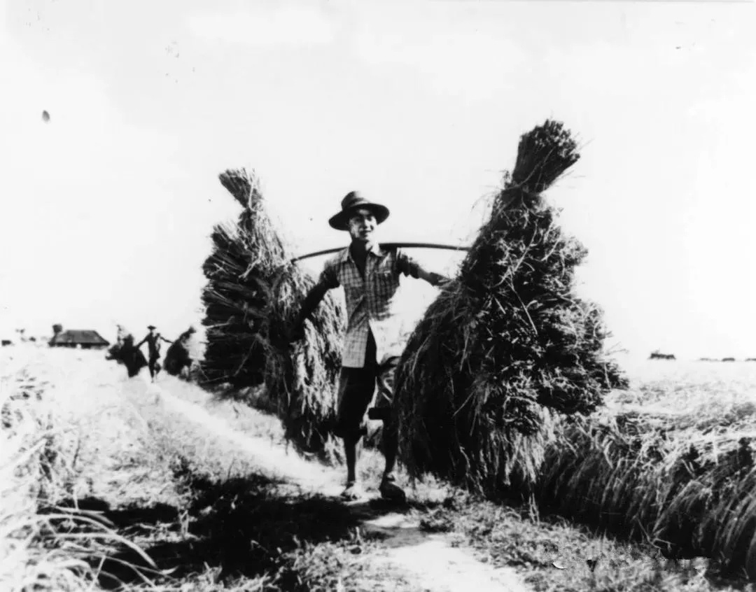 ▲新华社1975年12月8日稿,图为金山县枫围公社红旗生产队青年在割稻前先把道路两旁稻割去一条,使挑稻时不致碰落稻谷。